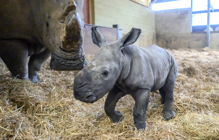The southern white rhino calf, tipping the scales at 45kgs, was born on March 7, to mum Jaseera and dad Sizzle at the UK’s largest zoo.